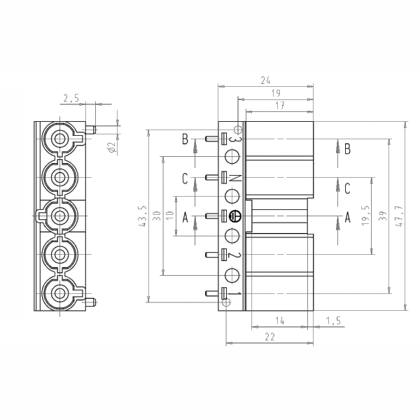 设备连接器,PCB安装,GST18i5,5极,垂直式,公头,250/400V,16A,额定脉冲电压4KV
